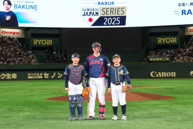 始球式は「RAXUSこどもたちの夢応援プロジェクト2025」で選ばれた、保育園、学童野球チームとも同じで、ともにプロ野球選手を夢見る小学6年生バッテリー(池田航大さん、村石将咲さん)。ノーバウンドの素晴らしい投球を見せて、スタンドからは温かい拍手が送られた。